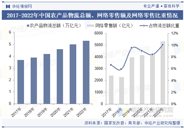 2017-2022年,国内农产物物流总额从3。7万亿添加到5。3万亿;农产物收集零售额由2437亿元增加到5314亿元,占农产物物流总额由6。6%提高到10%。